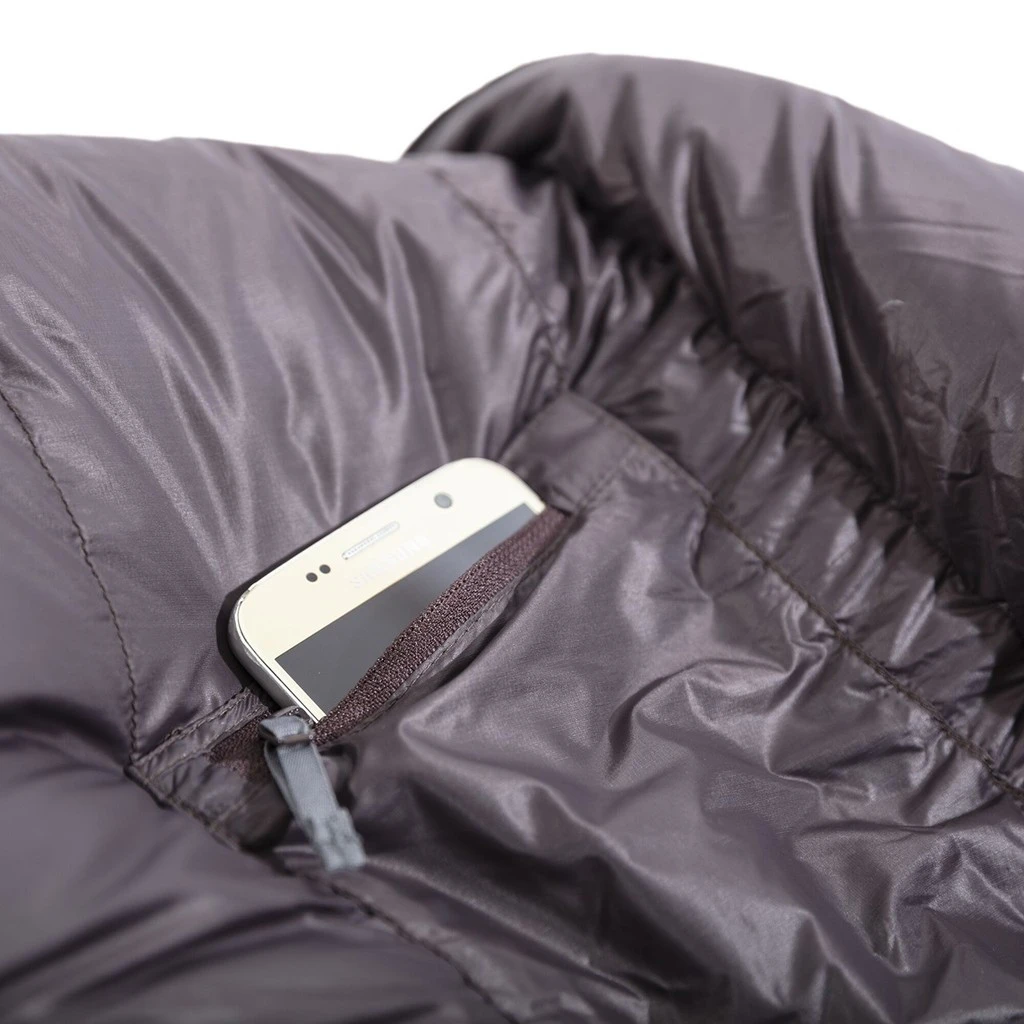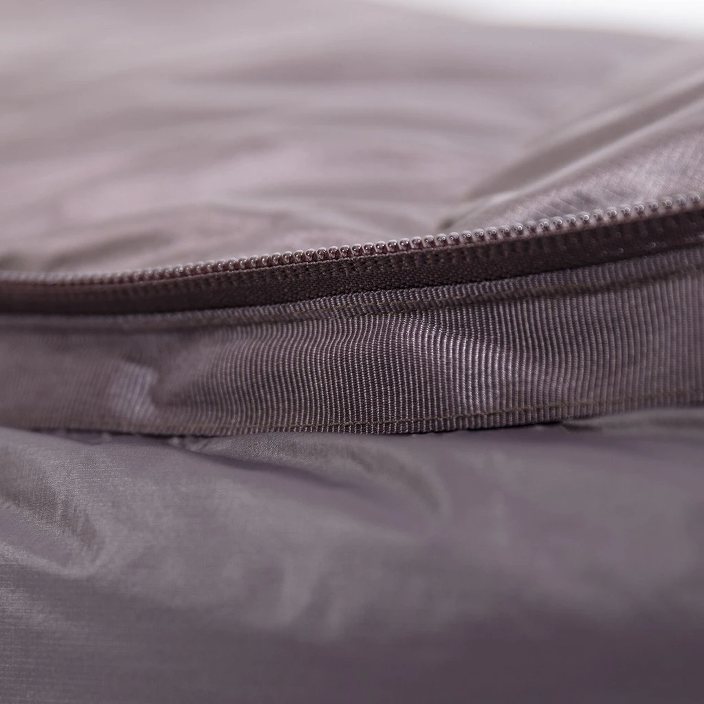 Le tissu en Pertex Quantum de 20 deniers est très léger et traité déperlant sur l’extérieur du sac de couchage. Le tissu intérieur en 15 deniers est doux au toucher. Le sac de couchage comprend également une poche zippée et il est fourni avec une housse de compression à sangles.