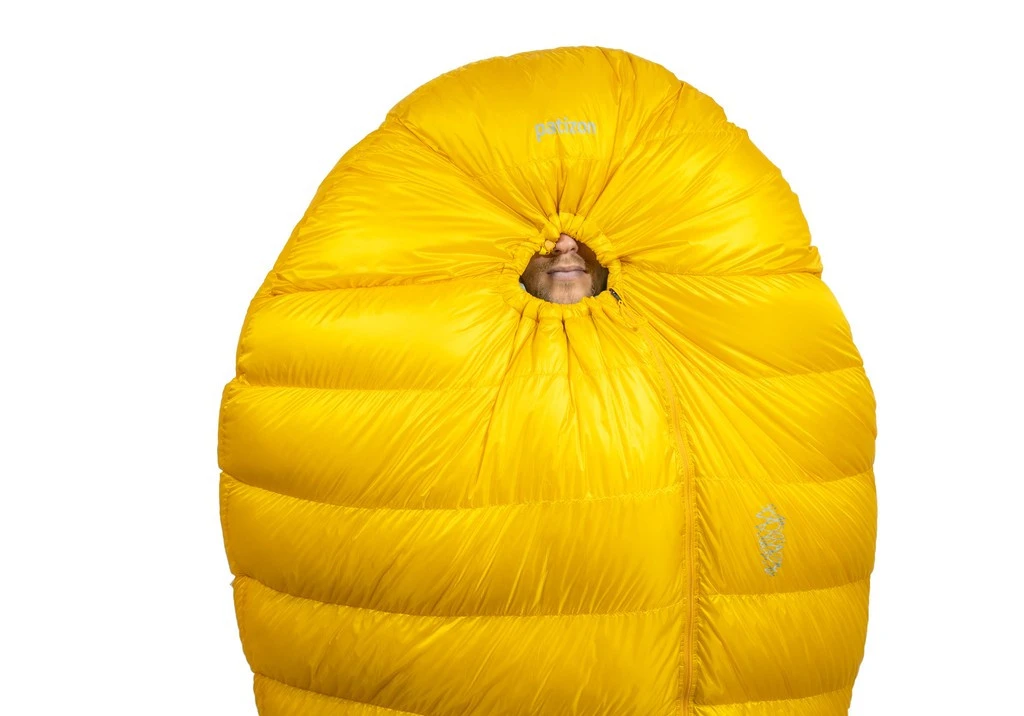 Le G800 est confectionné avec un tissu léger en Pertex Quantum Ripstop DWR, traité contre l’humidité. Sa fermeture éclair semi-automatique de 3 millimètres à deux particularités. Elle remonte sur le dessus permet de la trouver plus facilement dans le noir et d’obtenir une construction plus anatomique au niveau des épaules. Le zip est muni d’un bloqueur, une fois celui-ci enclenché, il ne coulisse plus. Pour protéger le duvet de l’humidité expirez pendant la nuit, le pourtour du visage dispose d’une isolation en fibre synthétique Climashield. Elle ajoute par la même occasion un confort supplémentaire au niveau du cordon de la capuche.
