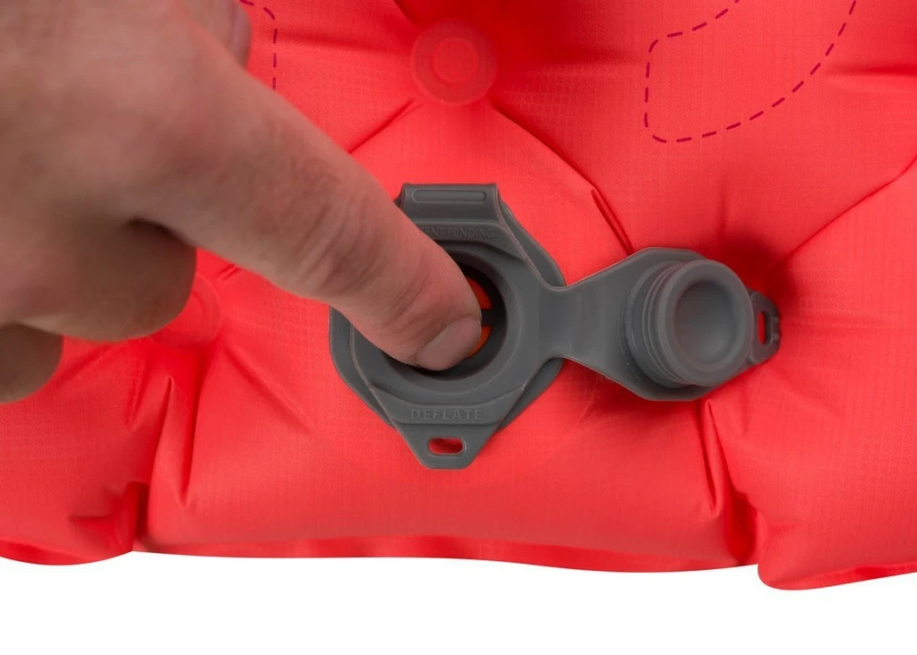 Valve plate développée par Sea to Summit. Cette valve à clapet anti-retour facilite le gonflage et le dégonflage. Le matelas est livré avec le sac de rangement et de gonflage Airstream Pumpsack.