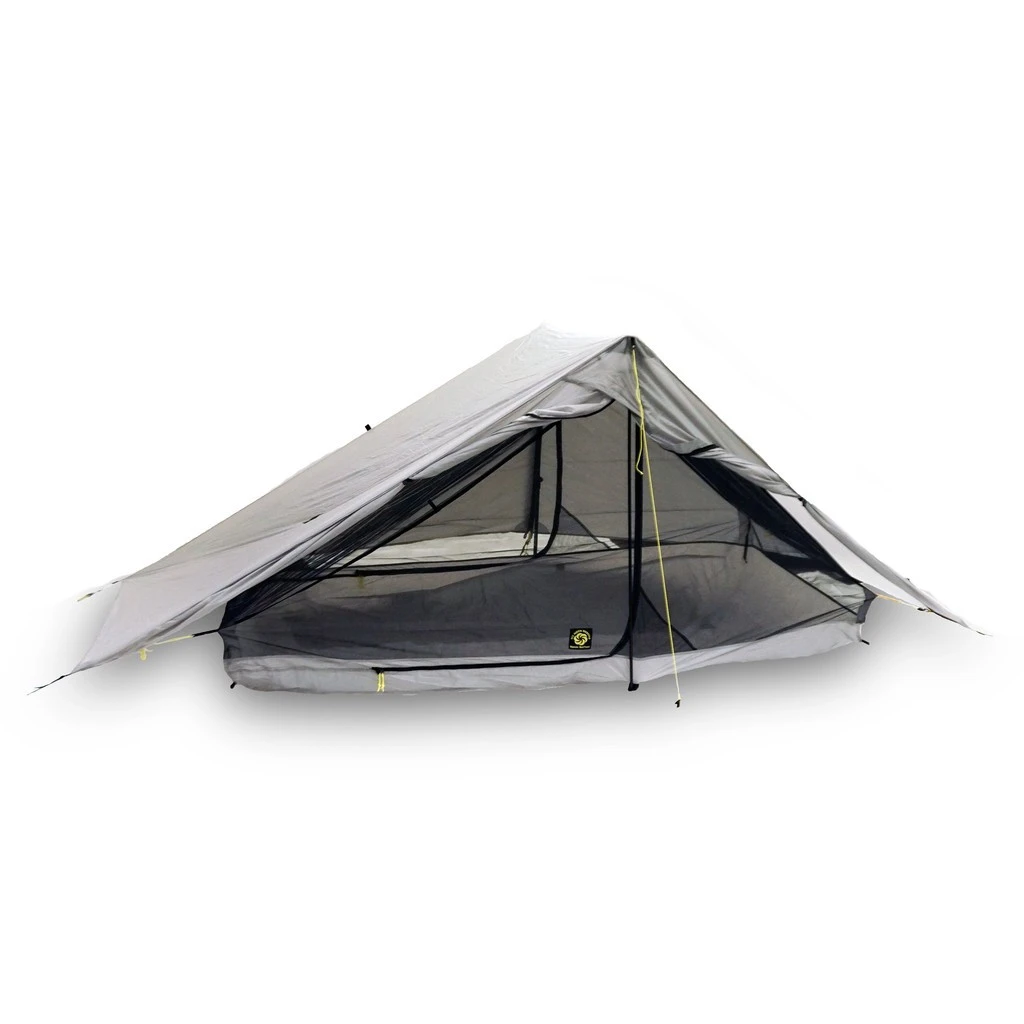 Le montage extrêmement simple nécessite soit 2 bâtons de randonnée, soit deux mâts (vendus séparément) et 6 sardines (vendues séparément). Des sangles réglables à chaque coin permettent de bien tendre l’ensemble, assurant la stabilité de l’abri. Spacieux pour deux personnes, elle dispose également d’une hauteur convenable de 114 centimètres. Ses deux larges portes s’ouvrent sur toute la largeur de la porte, favorisant l’accès et permettant d’admirer le panorama, même lorsqu’il pleut. Deux ouvertures sont situées sur le haut des portes, assurant la ventilation du tarp.