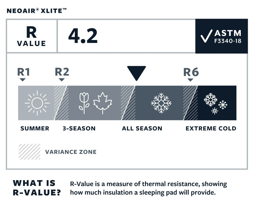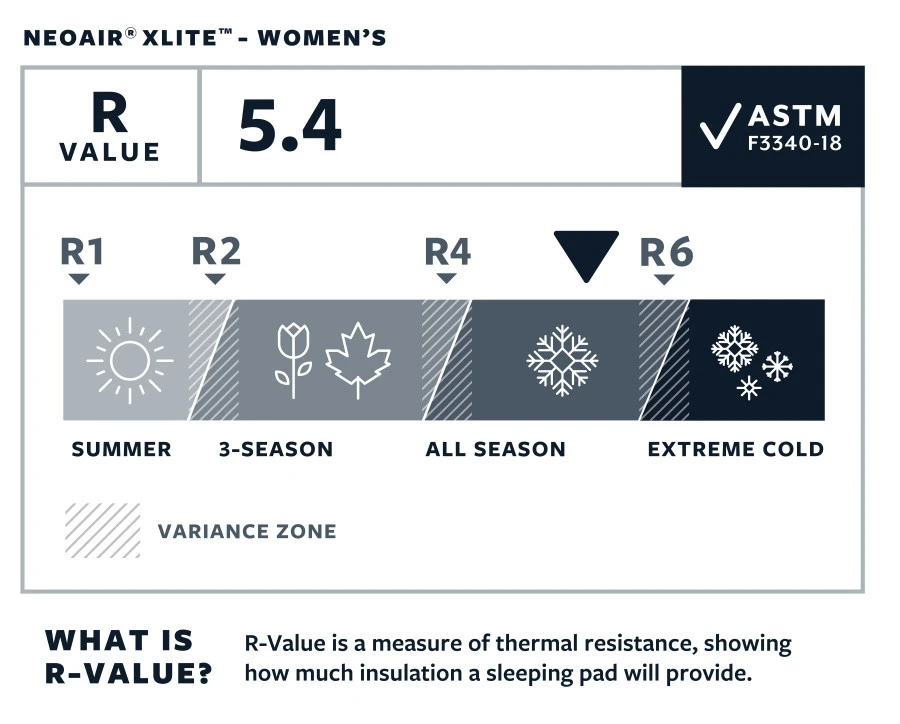 Le NeoAir XLite est un tapis de sol 4 saisons avec une isolation performante obtenue grâce Ă l’utilisation de barrières rĂ©flĂ©chissantes Ă l’intĂ©rieur du matelas. Ces feuilles d’aluminium permettent une convection de la chaleur. La chaleur est emprisonnĂ©e dans les boudins et est rĂ©flĂ©chie vers votre corps ! Ce procĂ©dĂ© permet de stopper le froid venant du sol. En taille 119, 183 et 196 cm le matelas a une rĂ©sistance thermique R-Value de 4.2, calculĂ©e avec la nouvelle norme ASTM F3340-18. Le modèle femme de 168 cm est dotĂ© d’une isolation plus importante et dispose d’un R-Value de 5.4, ce qui en fait un matelas 4 saisons. Pour cela, il est composĂ© de deux feuilles d’aluminium rĂ©flĂ©chissantes (au lieu d’une) et de tois niveaux de chambre Ă air dans les boudins.Â